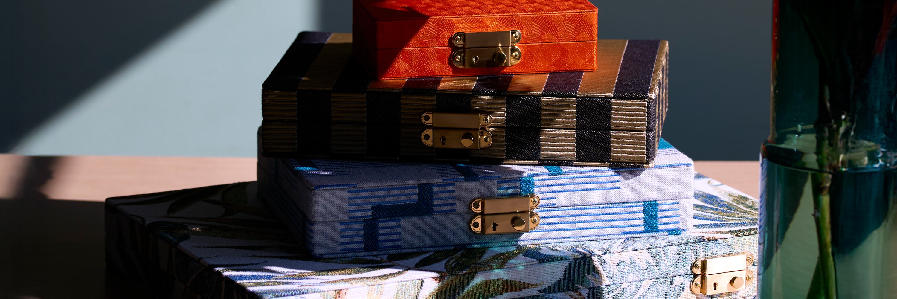 ソファーやカーテンなどインテリアファブリックとして使われる重厚感のある贅沢な生地を、石の買付の際にデザイナーが訪れた国々でコツコツと集めたもので、talkativeのウェディングボックス用に購入されたアーカイブ生地など、大切に保管されてきたファブリックを使用しています。