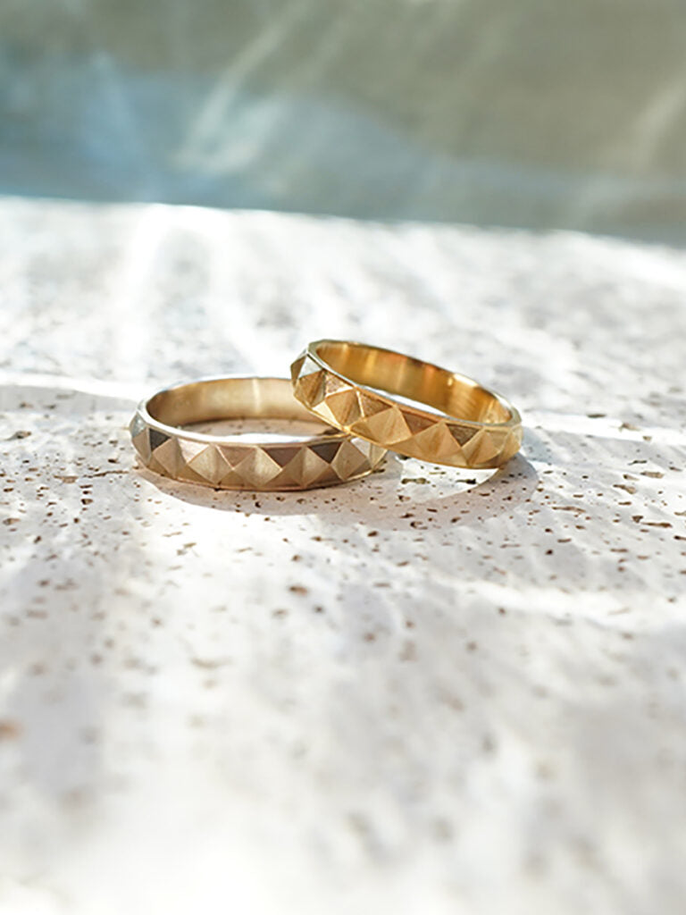 The engagement ring is set with princess-cut diamonds that resemble studs, giving it a fashionable sparkle.
